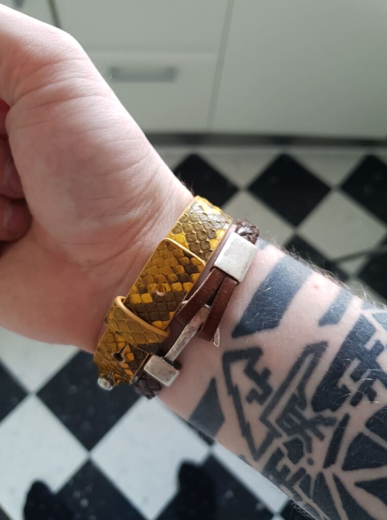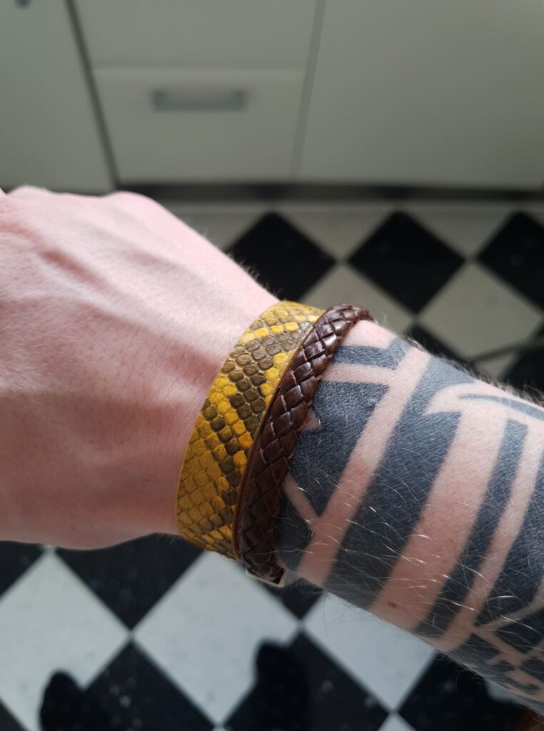 Pour être honnête, lorsque j’ai parcourus ses produits pour la première fois, je n’étais pas époustouflé. Les bracelets d’ancre sont quelque chose que je vois partout, et les t-shirts pourraient être un peu plus originaux au lieu du nom et du logo (quelques casquettes sont en fait plutôt chouettes). Mais cela a rapidement été éclipsé par tous ses bracelets et portefeuilles en python! Stylé serait le bon mot à utiliser ici, mais en même temps j’ai toujours été un fan de cuir de serpent et d’aligator! C’est donc un point de vue très subjectif! Néanmoins, j’ai dû essayer le bracelet en python jaune, qui est maintenant l’un de mes bracelets en cuir préféré (et j’en ai plein).