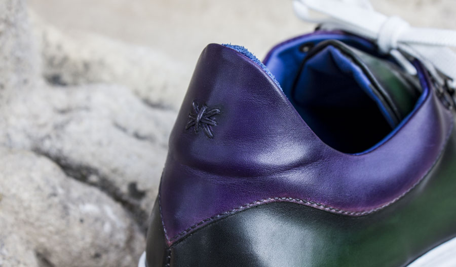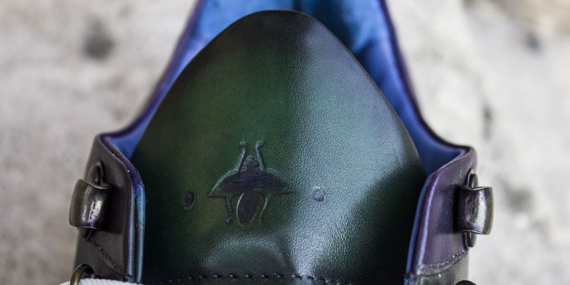 Coloris personnalisé : J’ai demandé un mélange personnalisé pour assortir à mon costume vert foncé et ma cravate violette — le logo discret avec l’insecte en violet sur la languette fait parfaitement le lien.