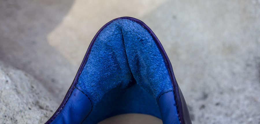 L’intérieur est doublé de cuir très fin, doux au toucher, avec un bon rembourrage autour de la cheville. Le talon est renforcé avec un matériau façon daim, probablement pour améliorer la résistance à la friction.