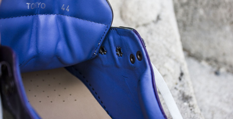 Détails au talon : Une couture épaisse forme une sorte de croix au talon, façon drapeau britannique, tandis qu’une pièce de cuir en pointe sépare les parties supérieure et inférieure à l’arrière.