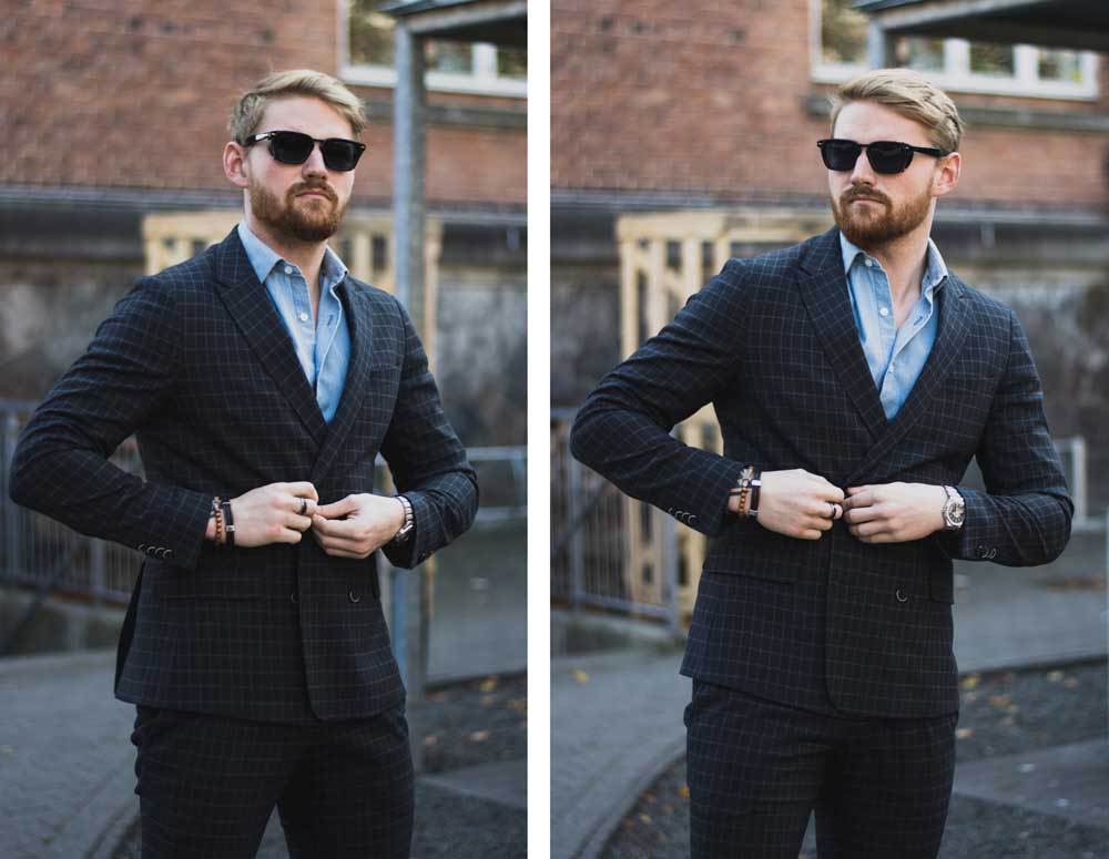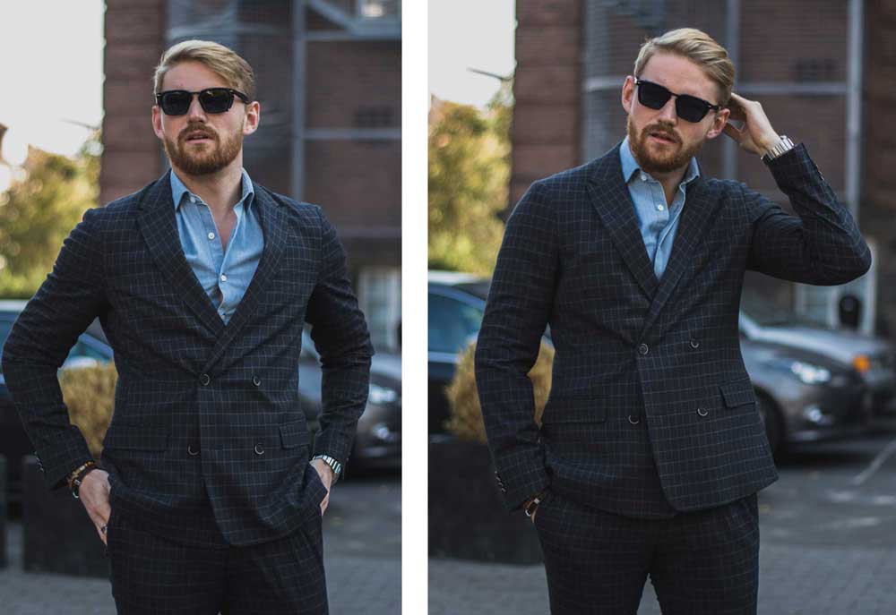 Les carreaux donne de la profondeur à un costume, le rend plus relaxe et te donne un look moins strict. C’est donc parfait pour sortir en ville prendre un cocktail, pour la fête de l’entreprise ou un rencard. Mais il faut savoir que si tu es très petit, reste sur des petits carreaux, car les grands carreaux va donner l’illusion que tu est encore plus petit et large. Pour ce shooting j’ai choisi un costume croisé à petits carreaux en bambou de Bertoni of Denmark. J’ai aussi fait un shooting avec un costume à grands carreaux (très grands), que vous pouvez voir ici.