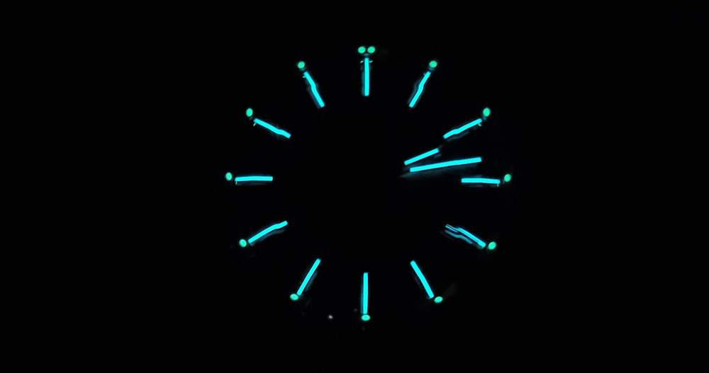 The applied hour markers are well finished with sharp edges and thick lume blocks. This avoids the grainy appearance that thinner lume applications often suffer from.
