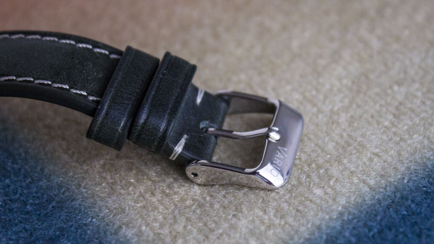 The included leather strap is a very dark green, almost black in low light. The quality is excellent, as expected from Vario.