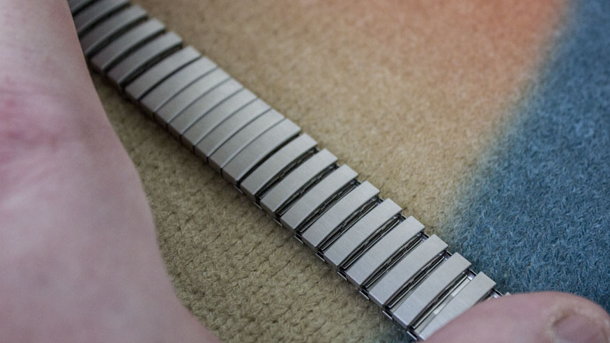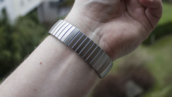 The metal strap is comfortable and expands slightly with wrist movement, allowing for a secure but forgiving fit.
