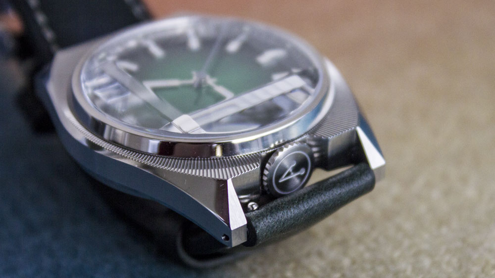 At a glance, the Futurist clearly draws inspiration from 1970s watch design. This is most evident in the faceted crystal and the compact proportions that echo vintage pieces from that era. At the same time, the watch introduces bold modern elements, particularly through the case finishing and unconventional crown placement.